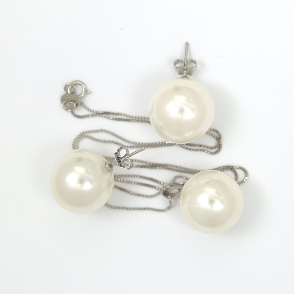 Das Set aus 16 mm absolut runden weißen Muschelkernperlen besteht aus Anhänger incl. Kette und Ohrsteckern in 925er Sterling Silber.