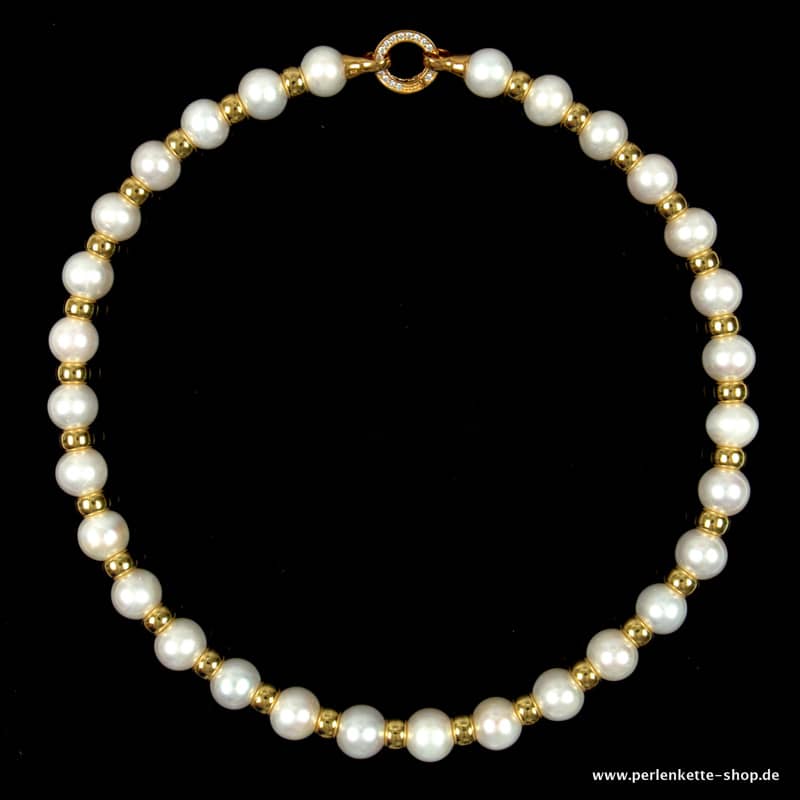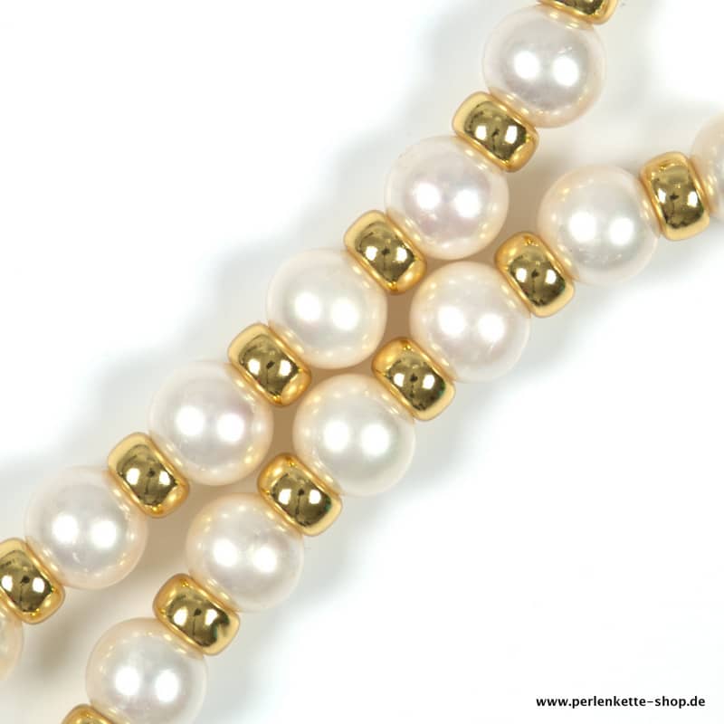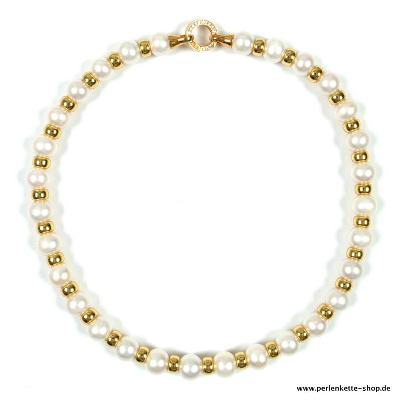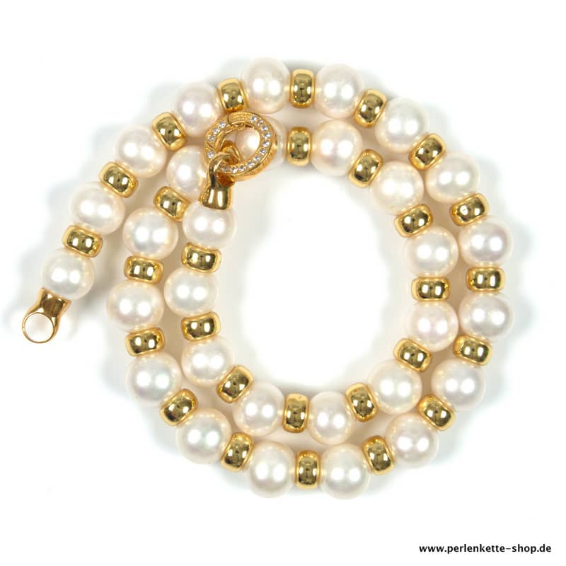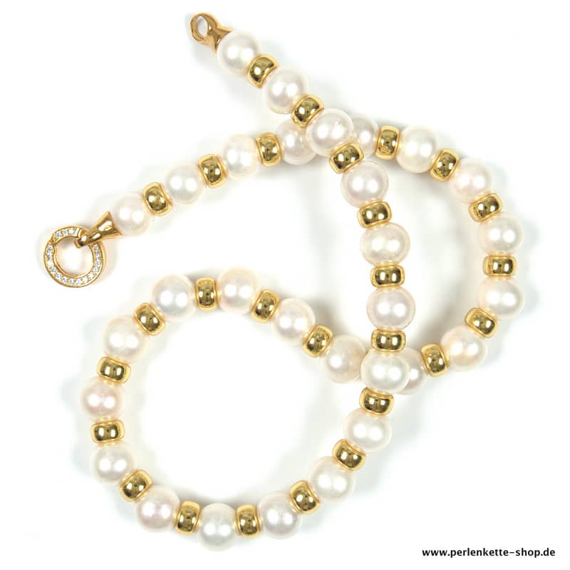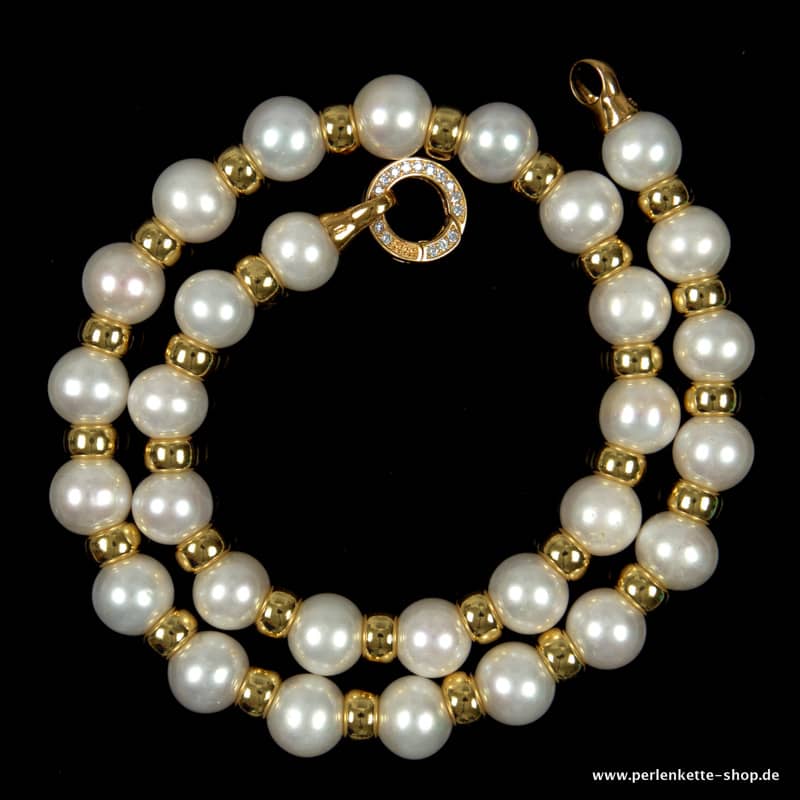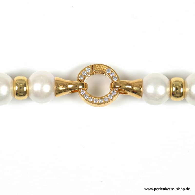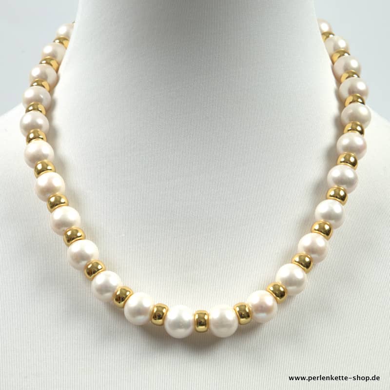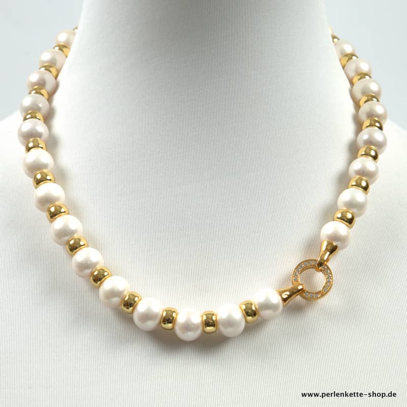 Hochzeits-Perlenkette in Weiß mit 12 mm Perlen und Gelbgold-Preziosen